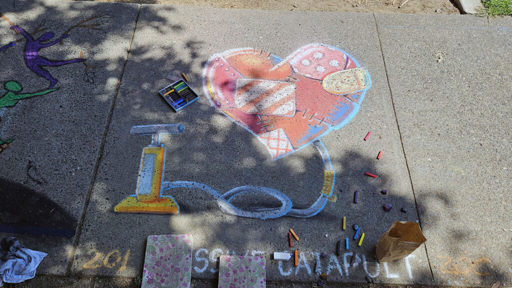 This year, I chose an illustration from Februdoodle, an illustration project I’d done earlier in the year, as my Chalk It Up drawing. The drawing I picked was of a bicycle pump inflating a patchwork heart, which I’d done for Valentine’s Day. It’s a relatively simple piece, but it gave me a lot of opportunities to render different materials and make it look dimensional, so it was a good choice.
